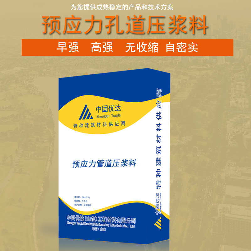 壓漿料一種專用于后張法預應力孔道壓漿施工材料,由多種優質水泥基材料和高性能外加劑優化配制而成,具有優異的流動性,漿體穩定,充盈度好,凝結時間可調,無收縮、微膨脹,強度高,不含對鋼筋有害物質等特點,預應力孔道壓漿料適合各種公路,高速公路,橋梁梁箱后張法預應力橋梁孔道壓漿,大型預應力結構孔道壓漿, 具有:流動性好,不泌水,不分層,填充飽滿充盈,密實無空隙,提高結構的可靠性,延長錨具使用壽命;飽滿高強,保證預應力筋與混凝土之間的粘結力等特點.